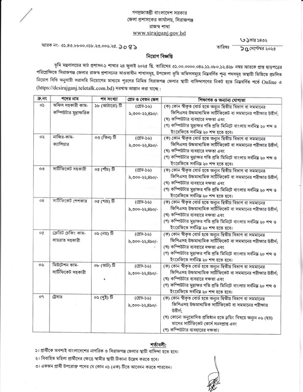 👉 অফিসিয়াল আবেদন লিংক: dcsirajganj.teletalk.com.bd